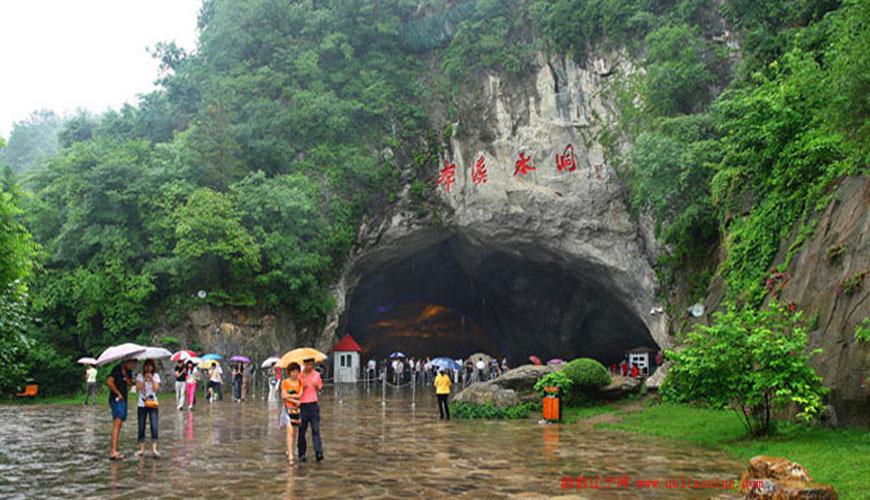 本溪水洞被群山包围着,到处郁郁葱葱层峦叠嶂,树木高耸少见荆棘,一条蜿蜒曲折的公路,依着俏丽的山峰,伴着潺潺的流水,径直通向了景区,把水洞映衬的格外美丽。