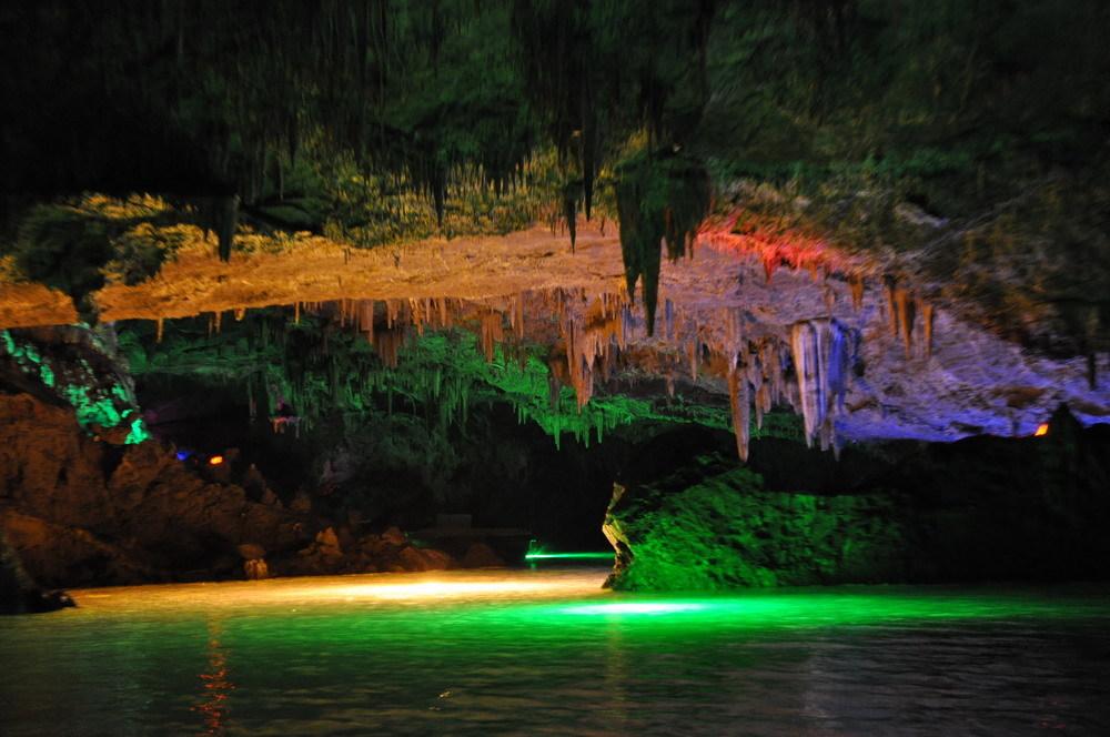 进入水洞,就感觉到一阵寒风迎面吹来,湿气很大。随着人流,我们排着队,先领了棉衣,坐上指定的船只开始参观水洞中的奇观景象。游戈在水洞的河道上,仿佛走进了龙宫仙境,各种造型的钟乳石在灯光的折射下美轮美奂,洞顶和岩壁的钟乳石多沿裂隙成群发育,呈现各式物像,自然生长。