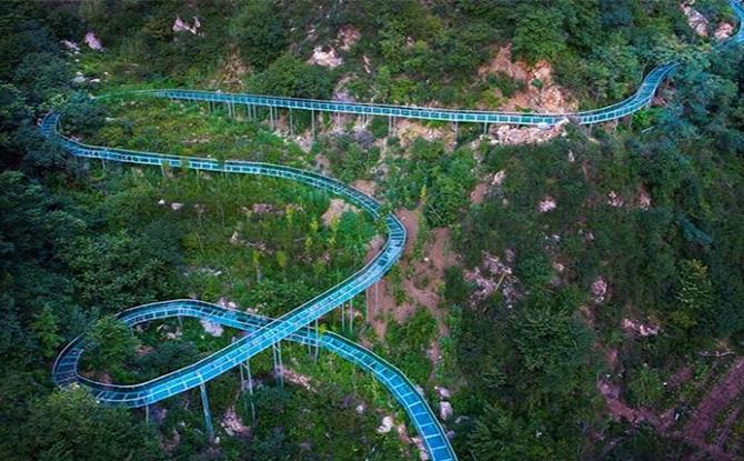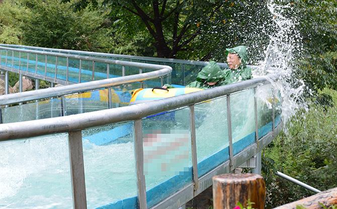 要说玻璃漂流的刺激之处,毕竟是在高空,看到前面数百米的滑道有如坐过山车一般,好在坡度较缓,不会有太快的速度,也不需要游客控制,几个弯道巧妙地把速度控制在安全范围之内。不过即便如此,转弯的时候也会有大量的水花飞溅,所以不穿雨衣肯定全身都会被打湿的。