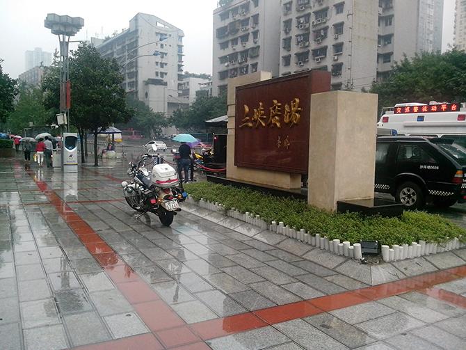 第二天依然下雨,去磁器口我特意提前两站在三峡广场下的车。就为拍了这个标志。附近有商业街,因为下雨也比较冷清。
