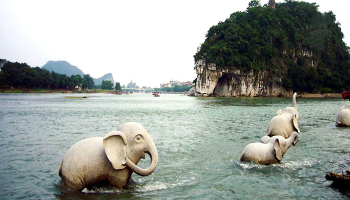 第一天,最先去了小学课本上的象鼻山,是桂林的城徽山,是桂林旅游的标志山,它坐落在桂林市中心的漓江与桃花江汇流处,形似一头鼻子伸进漓江饮水的巨象,象鼻和象腿之间是面积约一百五十平米的圆洞,江水穿洞而过,如明月浮水。