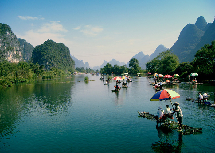 第二天早上7:30出门等车,随车导游也很好说话。8;00车子准时出发,9:20就到杨堤码头了,在漓江上,为了漂慢一点,我们每人给了竹筏师傅10元的讲解费,竹筏师傅也挺厚道,一路上都给我们讲解,到精华景点的时候还不忘停下来给我们拍照,11:00漂流到九马画山之后就下竹筏了,因为我们买的的是杨堤到九马的竹筏,然后凭竹筏门票免费坐电瓶车到兴坪古镇。漓江真是太美了,只能用图片形容了