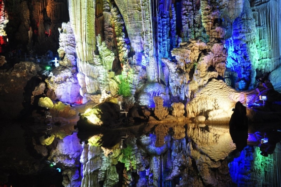 里面还有些积水,特别清。借着光能看得清睡眠的倒影,再仔细一看,能看到水里各种形状的溶洞。