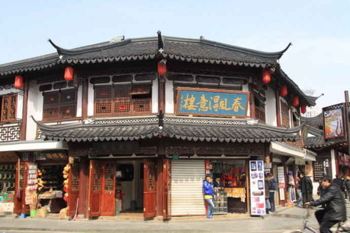 1.校场路口附近的“春风得意楼”是有名的老茶楼,招牌茶是18元一杯的元宝茶,茶中有青橄榄(在上海话中发音与“请过来”相似)两颗 ,讨个口彩,每到周六、日14:00---16:00,茶楼里都有评弹演出。
