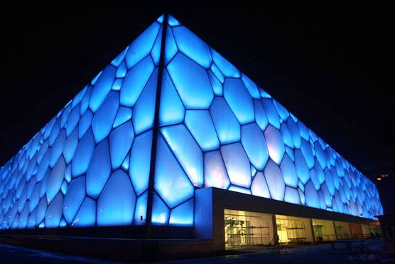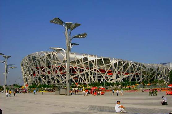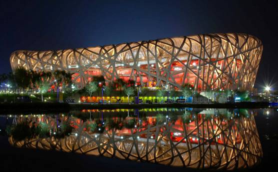 吃饭花了好久,吃好饭慢慢悠悠去鸟巢那边。地铁5号线转10号线再转8号线,花了一个半小时。哈哈,老妈对鸟巢的兴奋程度明显高过了参观天安门。傍晚的广场人不是很多,鸟巢更显得壮观。水立方就在鸟巢斜对面,也在夕阳的照射下折射出美丽的蓝色光圈。鸟巢好像在举办什么活动,不让进去参观。我们只能在外面拍拍照。不过这鸟巢可真够大的。为了看夜景下的水立方我们在附近找了个小餐馆吃饭,随便吃了点酸辣粉之类的,静待天黑。