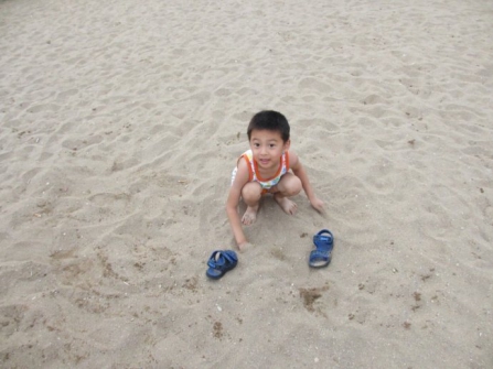 水相对比较冷,不敢让孩子待太久,玩了一会儿就给他叫上来了,让他在海边玩沙子。