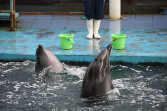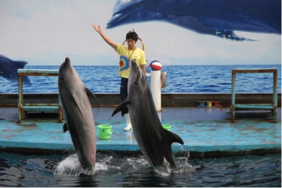 小动物的表演引得儿子连连鼓掌,主持人邀请小朋友来亲吻海豚的环节儿子更是把手举得高高的,可惜我们坐的太远没有被选中。