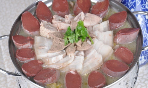 白肉,就是五花肉;血肠,是把猪血加入其他作料灌进肠衣煮制而成的。以猪肉、血肠为主要原料,吃起来肥而不腻,瘦而不柴,血肠脆嫩绵软,酸菜酸爽可口,热汤鲜香味醇,作料五味俱全,脍炙人口。