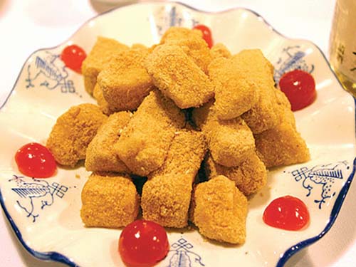 干豆腐串即是把干豆腐穿成串,辅以鸡汤,或炖或熏,朴实的豆腐便染上了鸡肉的鲜香。而又以老韩头豆腐串最为有名。豆腐串。分量小,味道也更清淡一些,可以根据自己的口味添加各种调料。