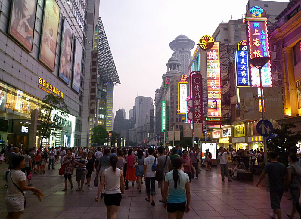 南京路步行街长约1200米,两侧商店林立,一眼望去,现代建筑夹杂着欧式老楼,竖挂的店铺灯箱连绵不绝,尤其夜幕之下霓虹灯光闪烁,别有风情。还可以坐一回像缩小版旧式电车的铛铛车,找找老上海的味道。