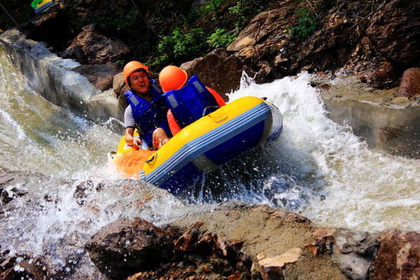 雾 灵西峰的漂流显然不是原生态场地,经人工设计,但全程只用一个“猛”字来形容。上来就是一个60—70度的坡,紧接着就是各种左右上下撞击起伏,各种坡 度、隧道、离心滑、颠PP滑……相当刺激;到了一个比较小一点的湖面,开始还是我们团队10个人互相戏水,后来就是不分人不分船的‘百船大战’,想不湿身 那是不可能的,还得是从头湿到脚,湿了个透心凉,在北京的烈日炎炎下,飘到如此地步,哪是一个‘爽’字可以形容的?