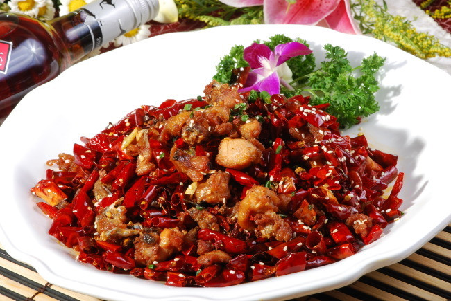 菜肴:辣子鸡是将酥脆的鸡胸脯块与干胡椒、芝麻和干辣椒一同翻炒,从而做出一盘子火辣辣红彤彤的美味。