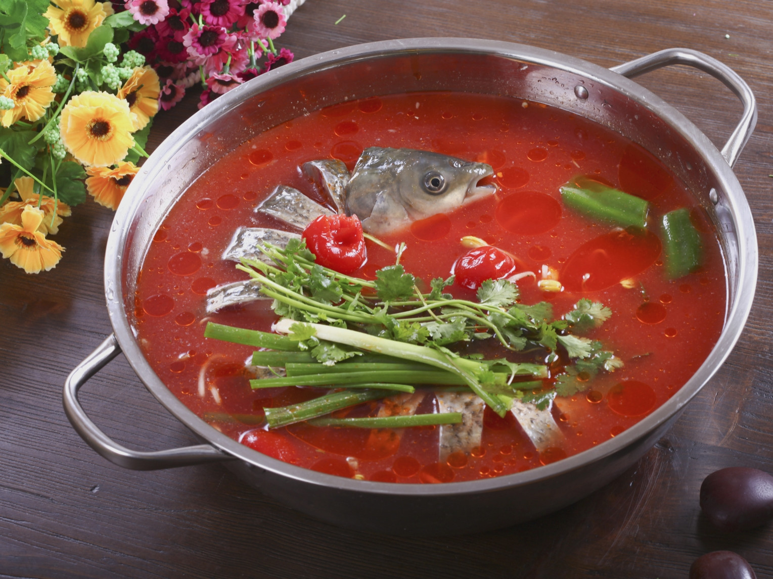 菜肴:酸汤鱼由酒酿或是番茄、泡椒和许多香草共同熬成,然后再放入刚抓回来的新鲜河鱼,即可做出超级酸爽的酸汤鱼了。