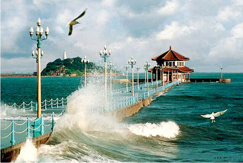 青岛还有一个非常美的景点就是栈桥,它位于青岛湾中,与市内最繁华的中山路连成一条直线,由海岸前伸入海,素有“长虹远引”之美誉。栈桥初建于光绪十八年(公元1892年),是青岛最早的码头。经1931年改建和1985年整修,现宽8米,全长440米。桥南端筑半圆形防波堤,堤内是一座具有民族风格的两层八角亭,金瓦朱壁,盔顶飞檐,题名“回澜阁”。栈桥两边有铁链护栏和莲花路灯,游人漫步于栈桥海滨,风平浪静时,可观看海鸥在此自由翱翔。走到桥的尽头还可远眺小青岛。岛上树影婆娑、绿荫成群,一座白灯塔亭亭玉立。