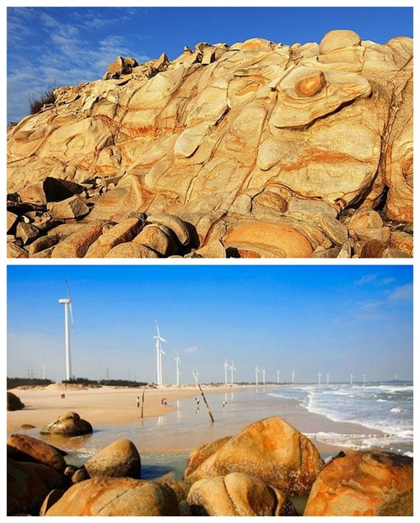 六鳌位于漳州市漳浦县,三面环海,形成半岛。东海岸的抽象画廊是一处风化花岗岩海岸风光,景区内沟壑连绵,每一沟壑便是皱皱叠叠的画卷,惟妙惟肖,形态万千。除此之外,六鳌半岛的风车群也是岛上一大看点。高耸的白色风车,配上蓝天白云、沙滩大海,让许多文艺青年趋之若鹜。