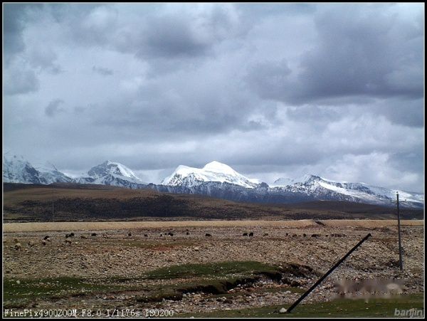 出拉萨过羊八井不久就进入念青唐古拉山脉了,路很好,坡度也舒缓,不知不觉中“轻车已过万重山”,青藏高原上又一雄奇的山脉——念青唐古拉山逐渐出现在车的左侧,绵延不已。雪峰上的积雪与天顶的白云融为一体,阳光间或射出云隙,那雪就闪烁出耀眼折射。山脚下常有牛羊成群,在雪峰的背景前颇有意趣。