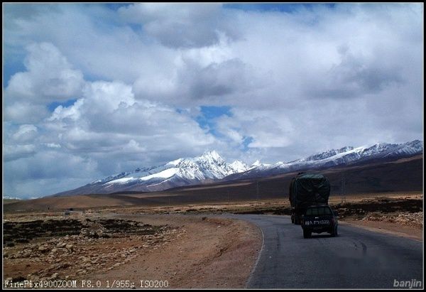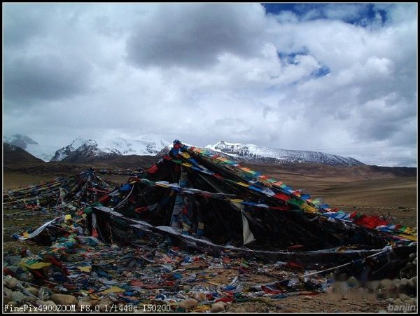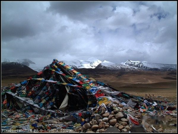在当雄前经过了念青唐古拉山山口,朴实无华的山口用经幡装饰着自己,没有标牌,也没有海拔高度的炫耀,哦,有一颗平常心的念青唐古拉山口。海拔4620米这个高度在此后直至昆仑山口前平均海拔4500米的青藏线上几乎就是个小土坡,所以山口并无标高牌也无什么特殊的标志,(据说2004年底在此建了座青藏公路通车50周年纪念碑,不过板四爷走这里的时候还没有)如果不是那逢山口必有的经幡,很多人会错过。