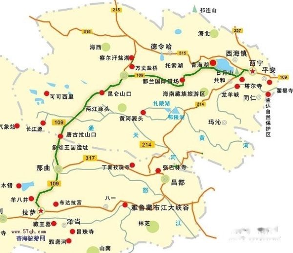 青藏公路起讫于西宁-拉萨是世界上海拔最高的公路之一。其中拉萨到格尔木要翻越四座大山:念青唐古拉山口(4620米)、唐古拉山口(5231)、风火山山口(5100)和昆仑山山口(4700米)。全长1160公里,全部黑色路面,除了个别地段外多是一条直线达天边,好像闭上眼睛开车也能走出几十公里。在青藏线上行车心情舒畅,极目远望那莽莽逶迤的雪山,浩瀚无边的草原,令你感到前途一派光明。绝没有川藏线、滇藏线那种行进在狭窄河谷陡峭山崖,随时要应付塌方滑坡塞路的那种前途未卜的揪心。天苍苍、野茫茫的青藏线会使您訇然震撼,心旌摇荡,一种自然升腾而又超越自我的感受,必将伴随着您的旅途悠久而长远,如果您高兴,拉萨到格尔木一日可达。