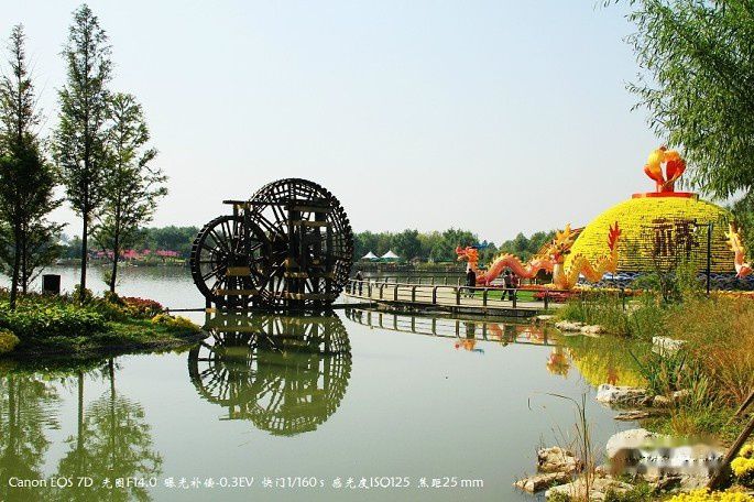 再往北则是幻花湖,在湖的东北侧有一个巨大的水车,大轮直径7米,小轮直径5米。