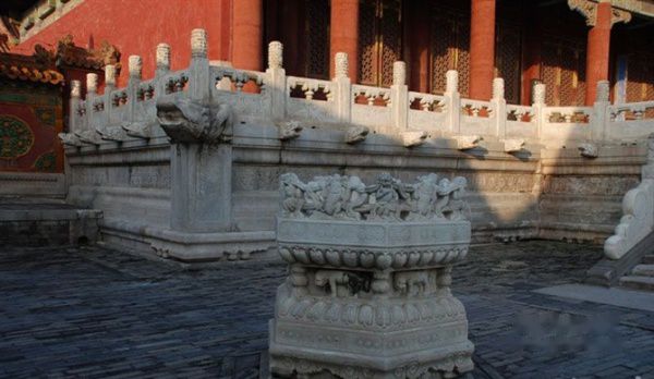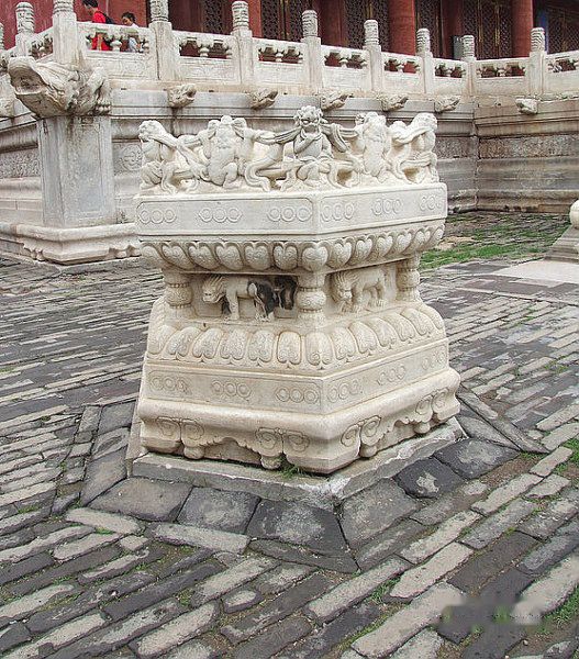 皇极殿丹陛左右分置日晷、嘉量,是体现皇权的重要陈设。御道两侧各有六方须弥座一个,座上置重檐六角亭,亭身每面镌篆体寿字各三。