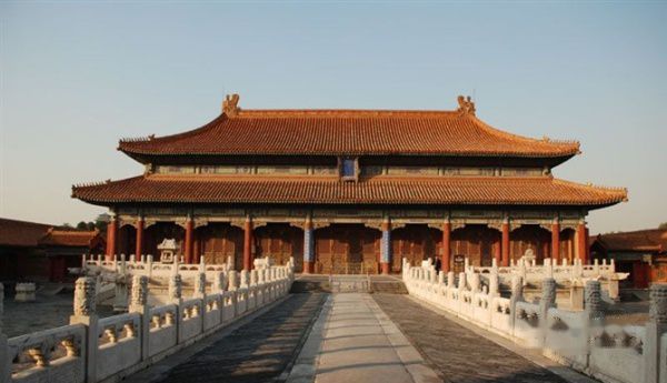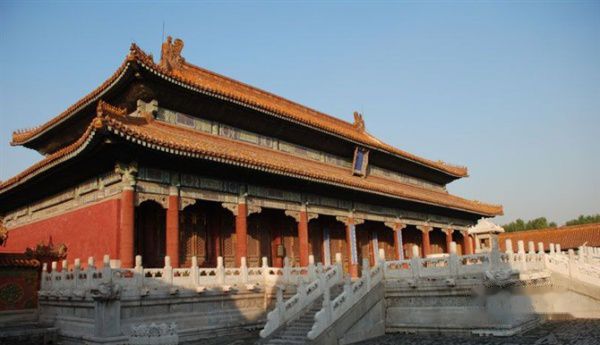 黄琉璃瓦重檐庑殿顶,前檐出廊,枋下浑金雕龙雀替。明间,左、右次间设殿门,余各次间下砌槛墙。后檐明、次间辟为殿后门,可达宁寿宫,余各间砌墙。殿中四根沥粉贴金蟠龙柱,顶置八角浑金蟠龙藻井,下设宝座,品级仅次于太和殿。殿内左置铜壶滴漏,右置大自鸣钟,制作考究。
