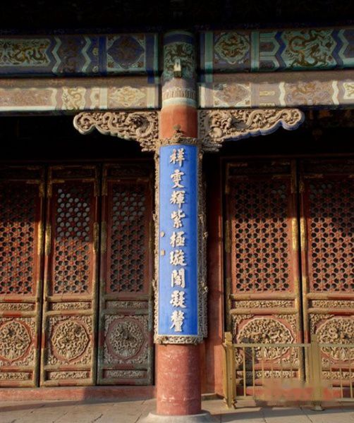 皇极殿左次间楹联:顺时宣象咸宜瑞履青阳开左个;懋德凝禔孔厚祥延紫气卫中垣。