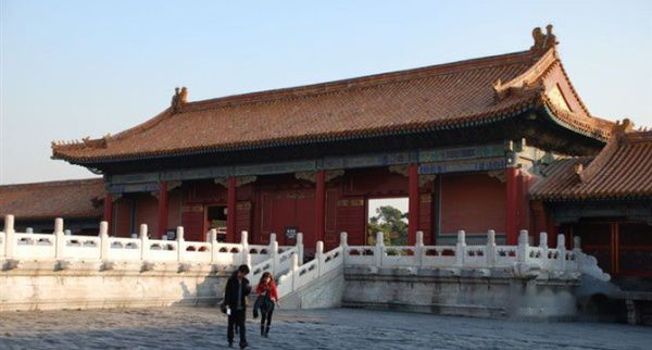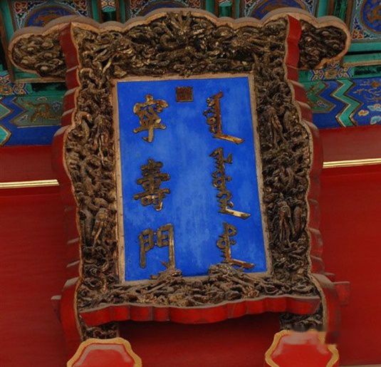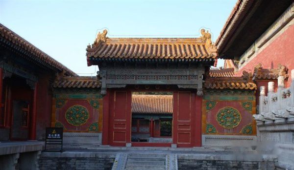 宁寿门建于汉白玉石台基上,中间设一丹陛,三出阶,门庭左右各置鎏金铜狮一尊。门内设高台甬路与皇极殿相连,周围以栏板为饰。