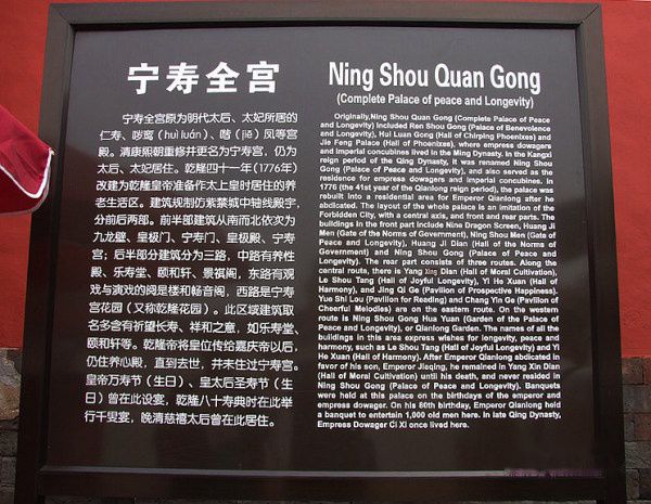 同治和光绪初年,慈禧经常在宁寿宫为自己庆寿和听戏,移住宁寿宫之后,慈禧为庆祝自己的六十大寿,拨银六十万两,修饰此宫。慈禧晚年,在宫内的住所就是宁寿宫内的乐寿堂,间或住在中南海、颐和园。