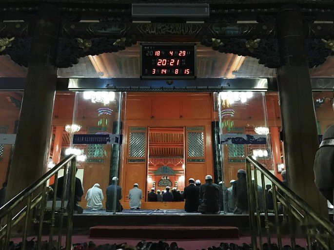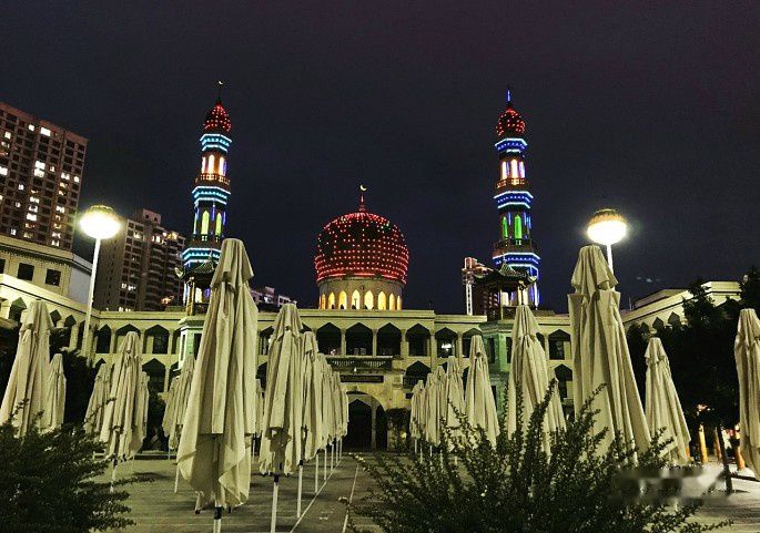 富有浓郁伊斯兰特色的东关清真大寺就在市中心,是西宁一座规模最大、保存最为完整的老建筑。大晚上的寺内仍灯火通明,教友们在专心做夜课。