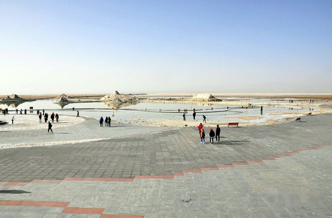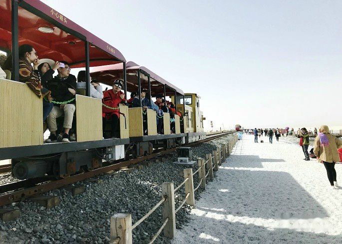 从停车场走进景区的最深处(也是最美处)有三公里路程,别少看这三公里,因为是行走在由盐粒铺出的松散步道上,每走一步都加倍用力。顶着猛烈的太阳来回走这条样的六公里,少点体力也不行。建议乘坐小火车,在惬意赏景的同时就已抵达最深处,然后徒步回程。