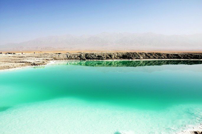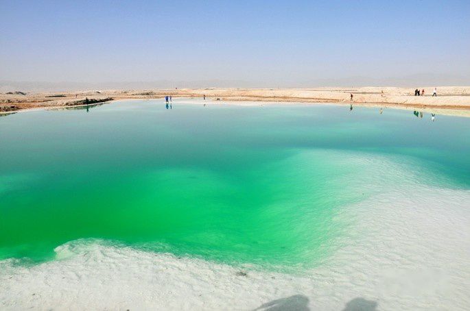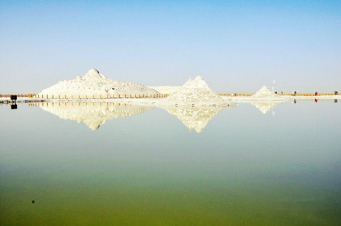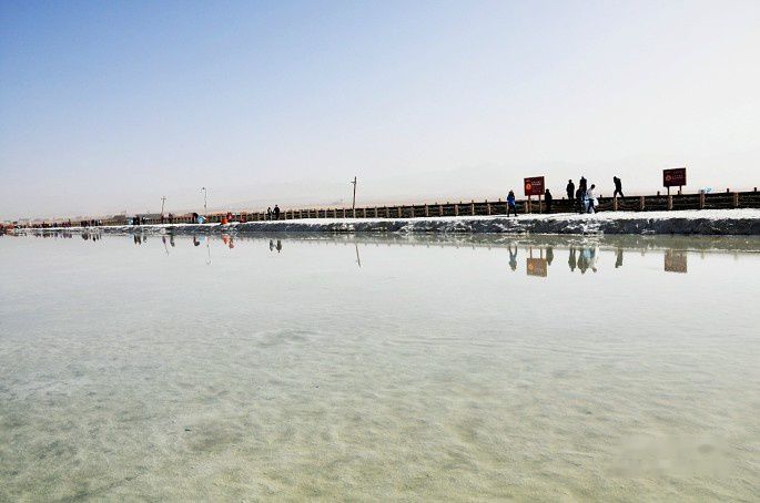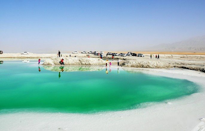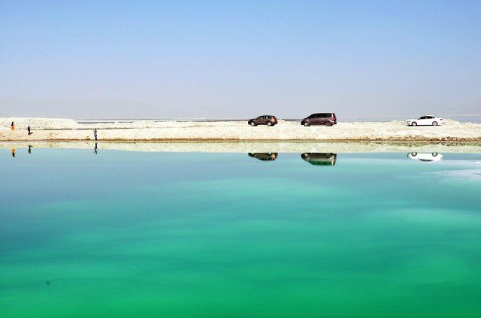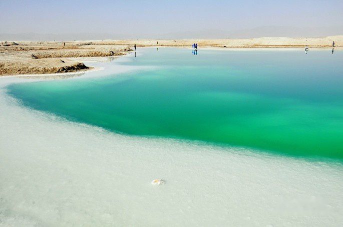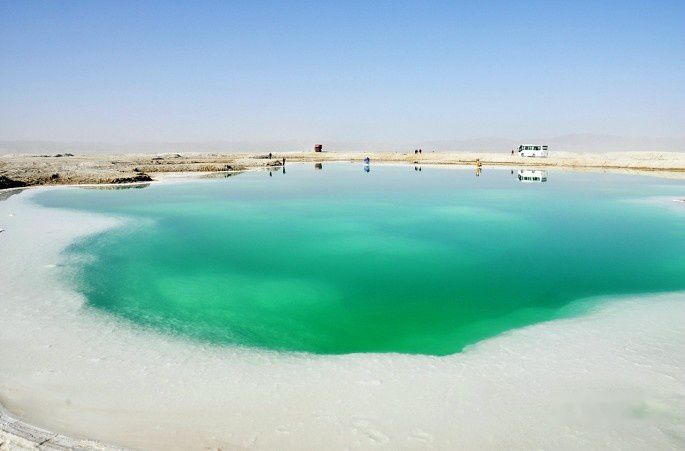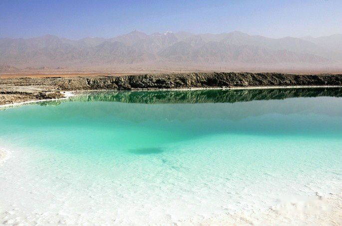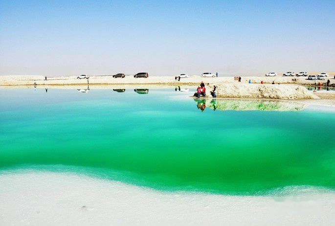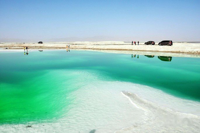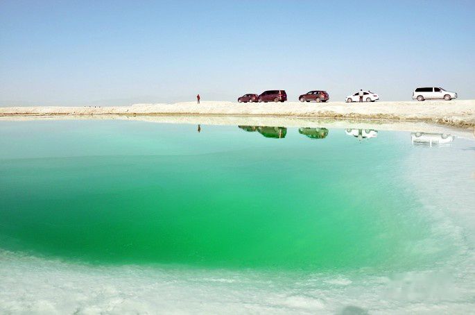 洁白的盐晶厚厚地铺在水底和岸边,湖面翠绿见底,风平浪静时可形成清晰的倒影。