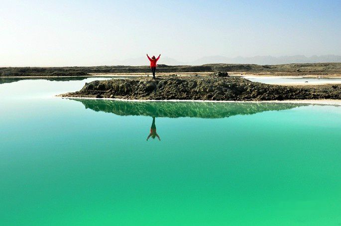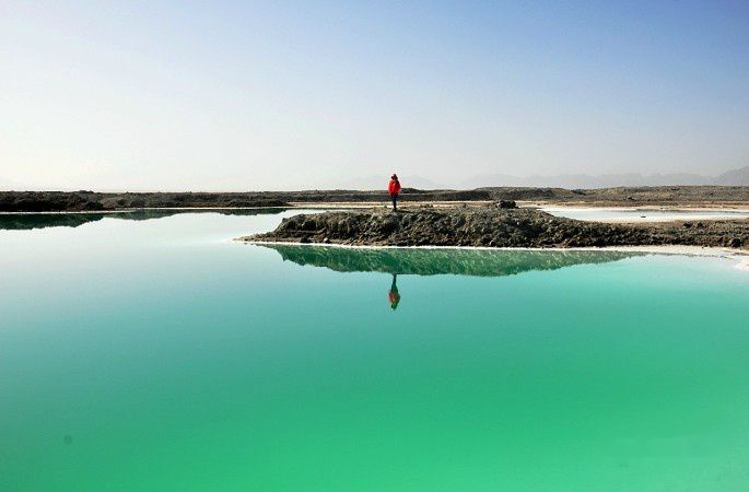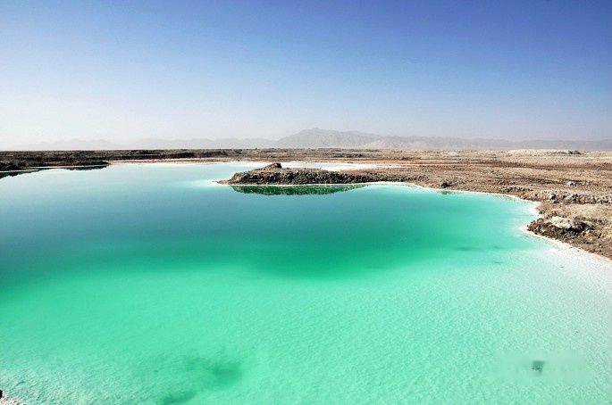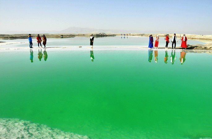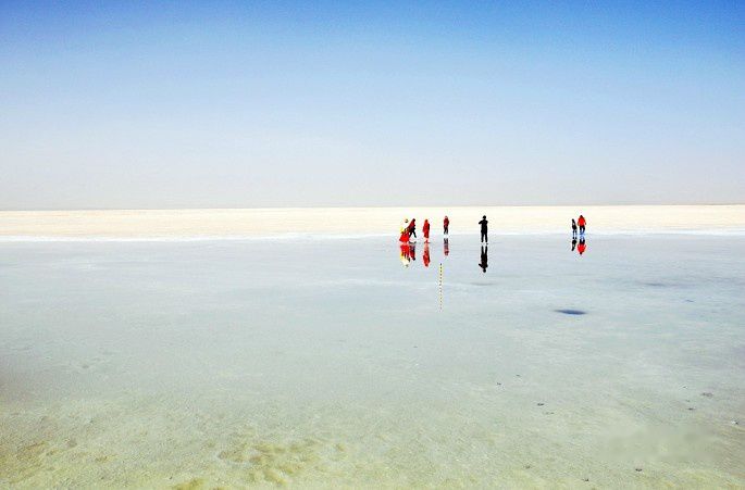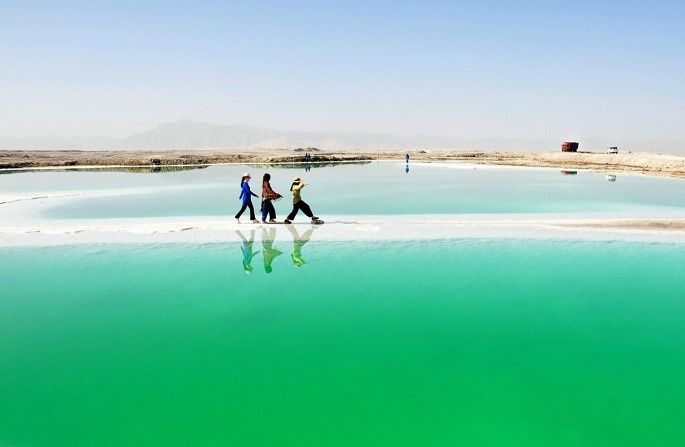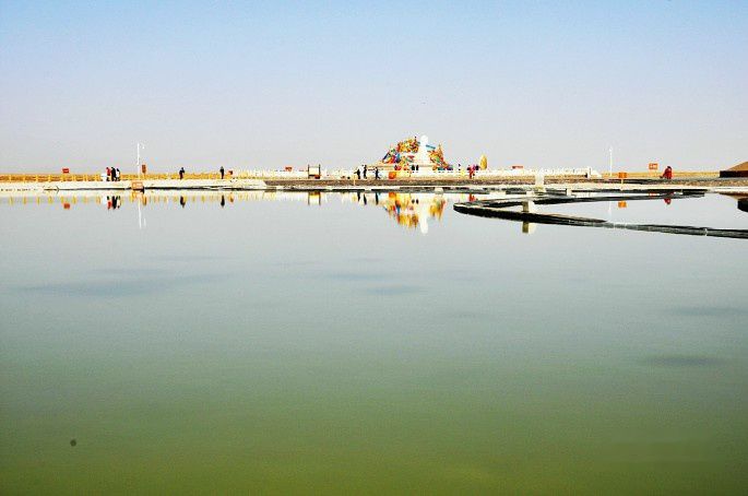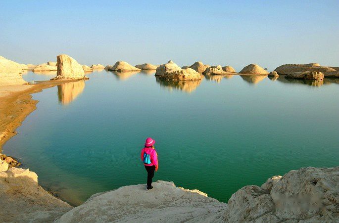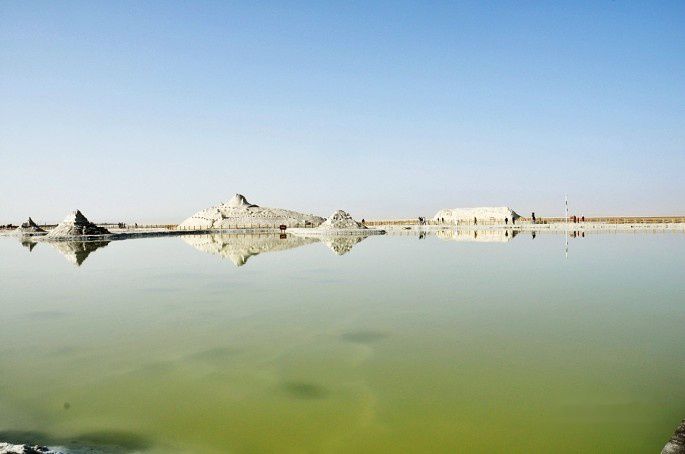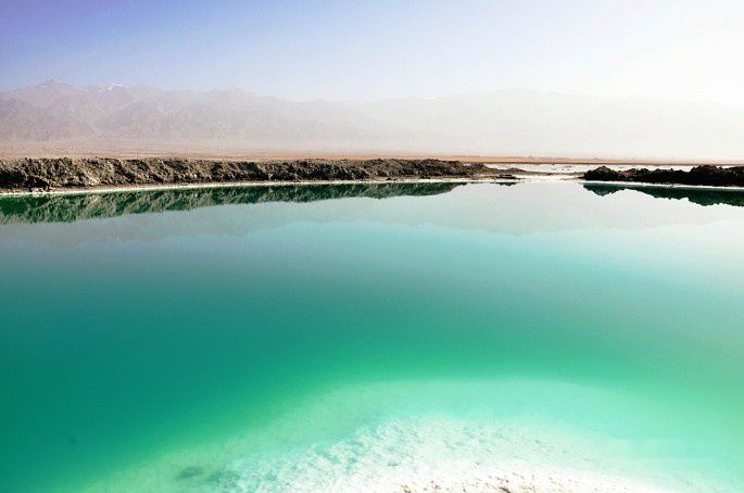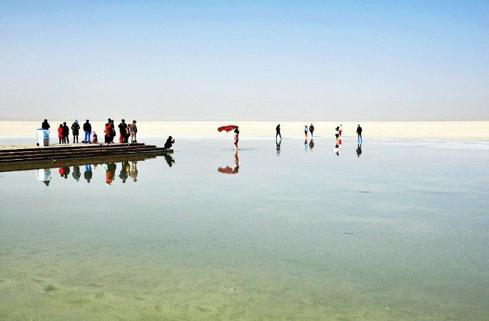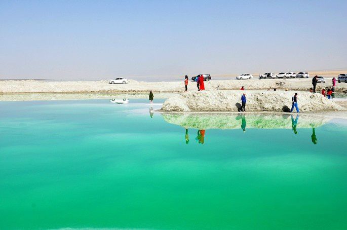 洁白的盐晶厚厚地铺在水底和岸边,湖面翠绿见底,风平浪静时可形成清晰的倒影。