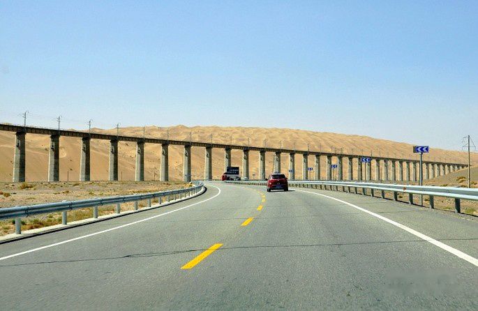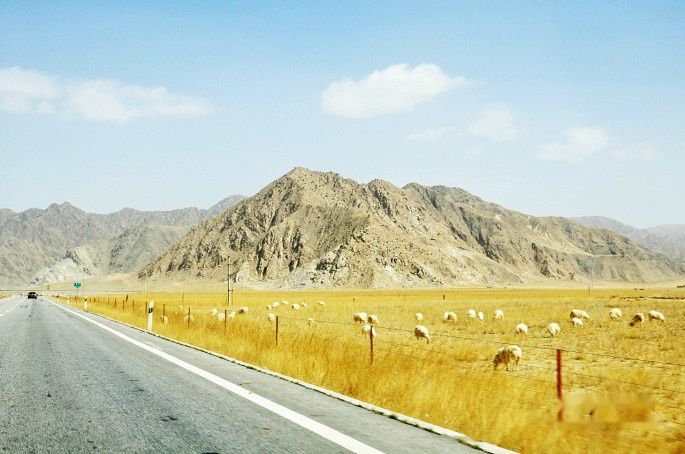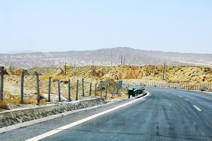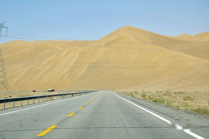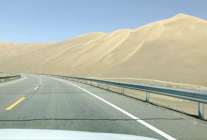 进入甘肃境后气温和地貌均有明显的变化,炎热干燥的气候使得沙漠化严重,公路两旁尽是连绵沙山。