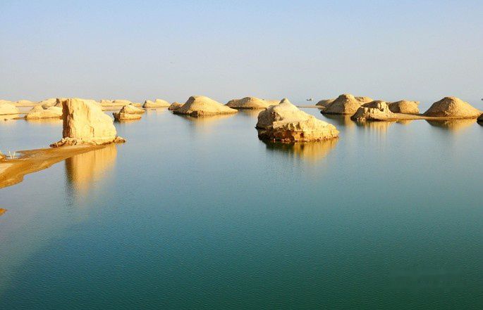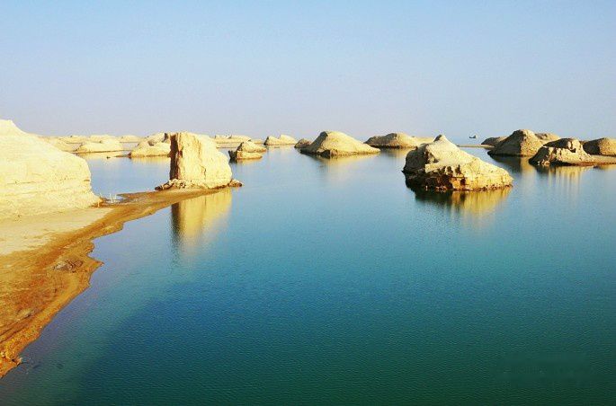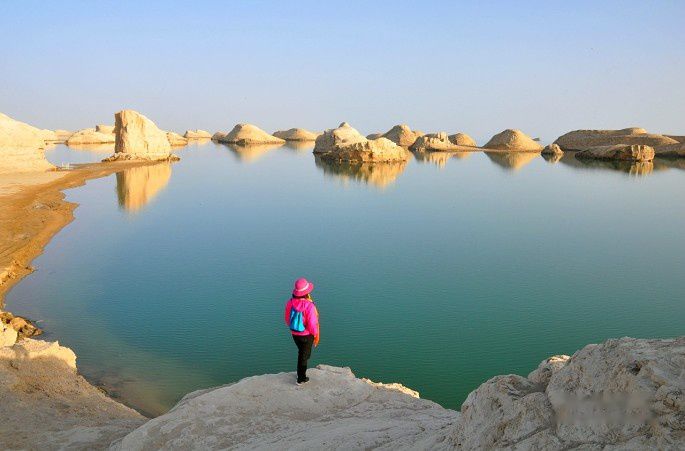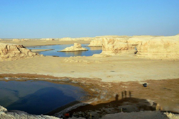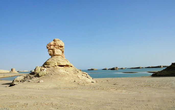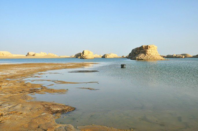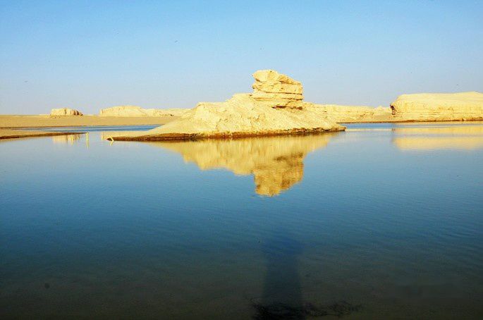 当你登高远眺时,就会愕然发现一望无际的荒漠中凭空而出一片“汪洋”,雅丹配合一望无际的湖面,犹如魔鬼城堡般的土林和清澈的湖水你中有我,我中有你,壮观威严。