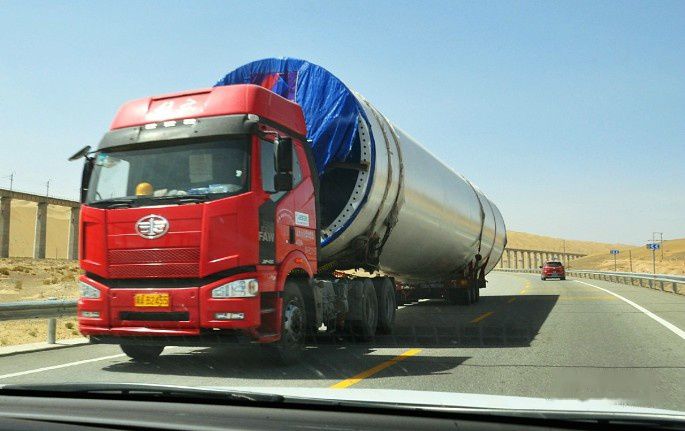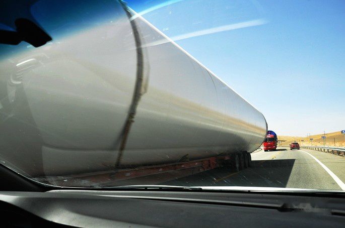 风力资源在地广人稀的大西北被充分利用,路上车辆不多,却不时遇上这些装载着庞然大物风车配件的超长车辆驶过。
