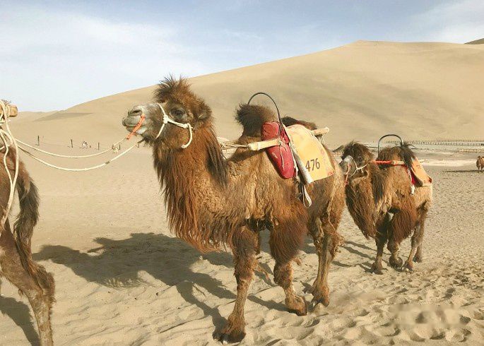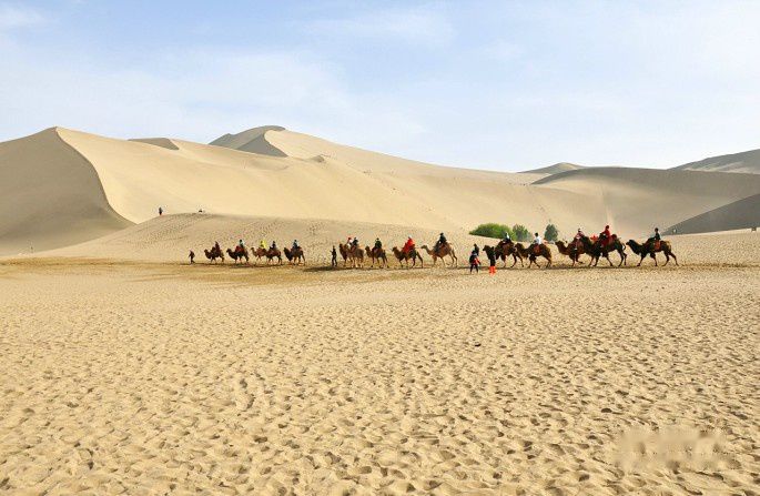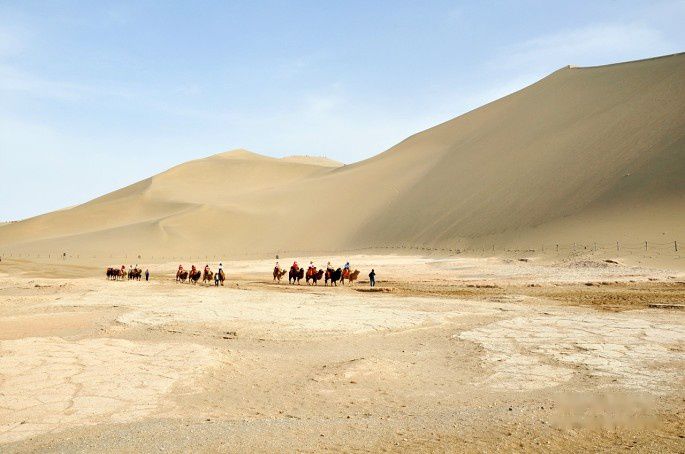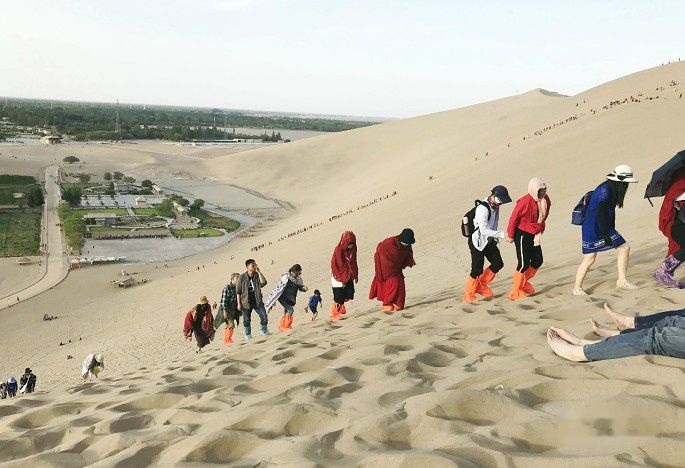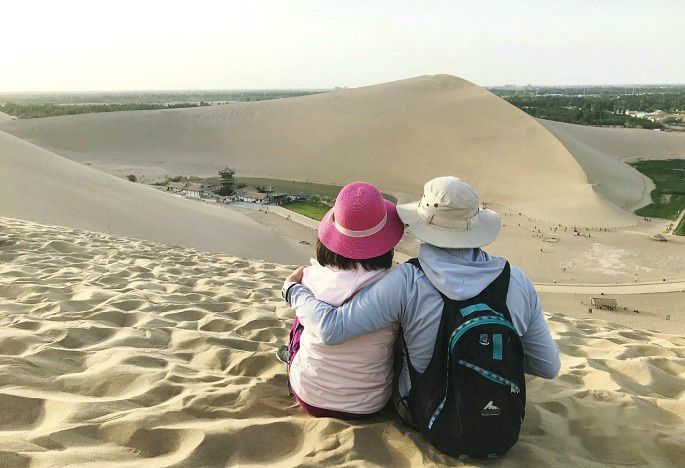 丝路明珠敦煌另一亮点是鸣沙山与月牙泉。沙漠地区干燥炎热的气候在太阳直射下气温高达40多度,不适宜户外运动。夏天的敦煌晚上9点多才日落,所以我们安排6点后出发鸣沙山。
