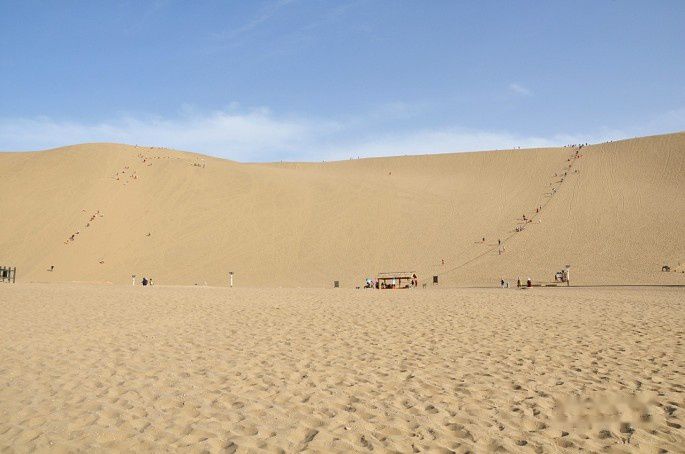 走过梯子后还可以在沙子上再往上行,临高遥望无垠的沙漠,不同的角度月牙泉的形态也变动。美中不足的是失去太阳的光芒,鸣沙山拍出来的相片也缺了亮彩。