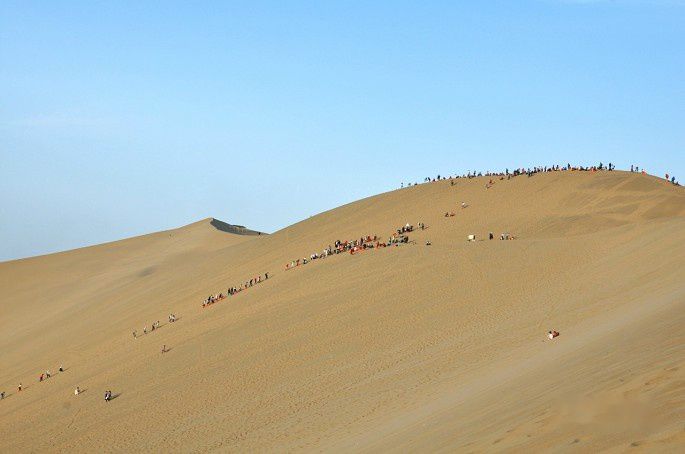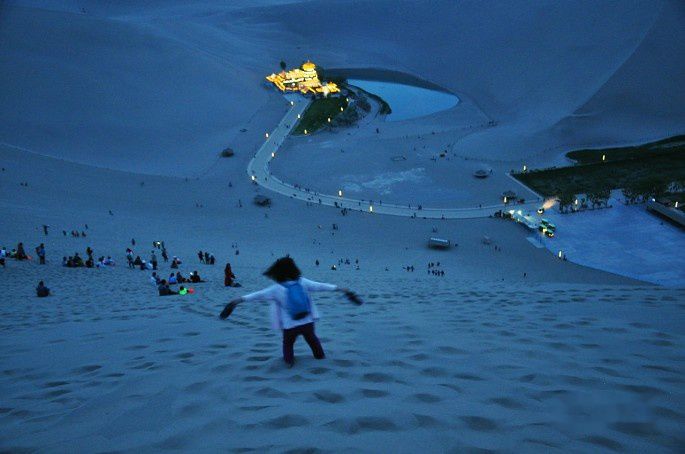 日沉西丘,这时候炽热的太阳退去,沙漠温度降下,也是最多人登鸣沙山的时候。
