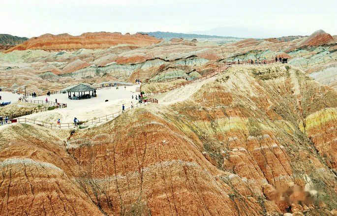 张掖七彩丹霞景区共开放四个观景台,分别是:七彩仙缘台(2号)、七彩云海台(1号)、七彩锦绣台(5号)、七彩虹霞台(4号) 。坐观光车可逐一前往欣赏不同的丹霞形态。不同门进入的游览顺序不同,北门进入的我们参观顺序是:2,1,5,4。