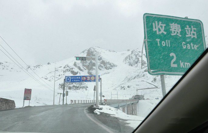 在风雪下的盘山公路开车,大家都格外小心缓慢行驶,收费站前出现了车龙。