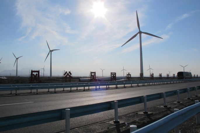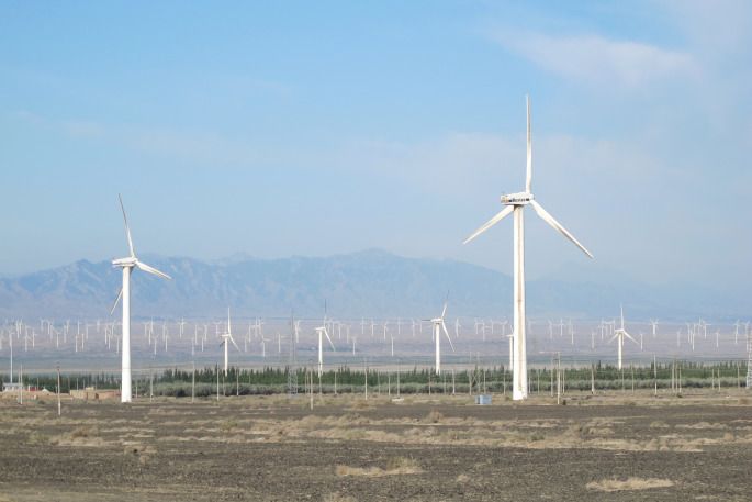 沿路南行,在通往丝路重镇达坂城的道路两旁,能看到上百台风力发电机擎天而立、迎风飞旋,与蓝天、白云相衬,在博格达峰清奇峻秀的背景下,在广袤的旷野之上,形成了一个蔚为壮观的风车大世界。这里就是目前我国最大的风能基地——新疆达坂城风力发电厂。