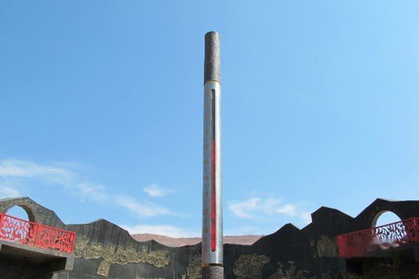 火焰山以红色的花岗岩反射阳光而闻名遐迩,这座火焰山又称“红山”。火焰山山长100多公里,最宽处达10公里,海拔500米左右,主峰海拔831.7米。火焰山童山秃岭,寸草不生,飞鸟匿踪。每当盛夏,红日当空,赤褐色的山体在烈日照射下,砂岩灼灼闪光,炽热的气流翻滚上升,就像烈焰熊熊,火舌撩天,故又名“火焰山”。火焰山是中国最热的地方,夏季最高气温高达摄氏47.8度,地表最高温度高达摄氏70度以上,沙窝里可烤熟鸡蛋。
