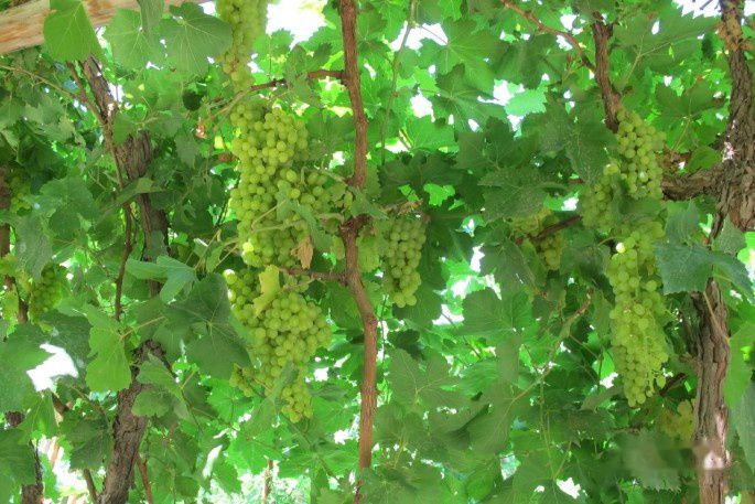 “葡萄沟”位于新疆吐鲁番市区东北11公里处,南北长约8公里、东西宽约2公里,是火焰山下的一处峡谷。沟内有布依鲁克河流过,主要水源为高山融雪,因盛产葡萄而得名,在葡萄沟溪流两侧,葡萄架遍布,葡萄藤蔓层层叠叠,绿意葱葱。四周是茂密的白杨林,花草果树点缀其间,农家村舍错落有致地排列在缓坡上。这里主要种植无核白葡萄,还有马奶子、红葡萄、喀什哈尔、日加干、琐琐等 13个品种。其果实呈球形、卵形、椭园形等,有的葡萄晶莹如珍珠,有的鲜艳似玛瑙,而有的绿若翡翠。那五光十色、翠绿欲滴的鲜葡萄,令人垂涎不止。