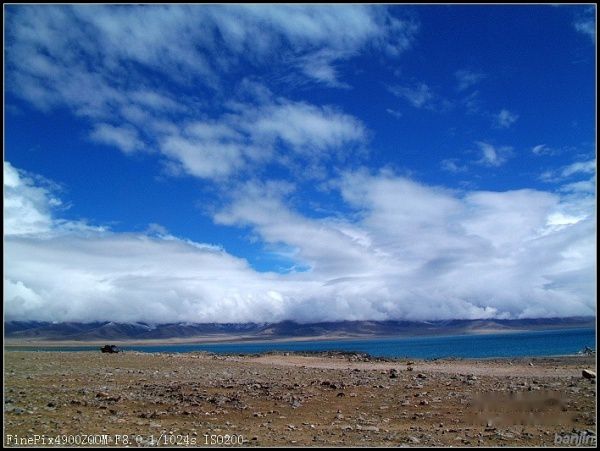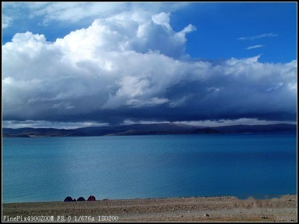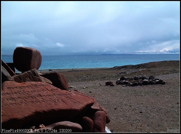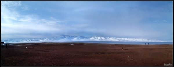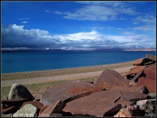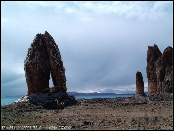 下山是更是胆战心惊,跌跌撞撞的行进了20多公里,一道蓝线跃入眼帘,看到湖啦。此前听别人说要到40公里处才能看到湖,可见当时的气候还不如今天,运气不错啊。据说很多车到这个山口匆匆远看纳木错就打道回府了,这其实是个错误,因为这么远眺之下纳木错和其它的高原湖泊并无两样,只有来到它的身旁才能领略它的浩瀚和神圣。巨大的湖面,巨大的经幡,巨大的玛尼堆,巨大的佛手石,纳木错沁人心脾的蓝色,念青唐古拉洁净无比的白色,美丽的传说令人神往的粉色,这一切都在向你述说纳木错的不同凡响。“纳木错”藏语“天湖”的意思,湖面海拔4718米,东西长70多公里,南北宽30多公里,总面积为1900多平方公里,纳木错是西藏三大圣湖之一,是世界上海拔最高的咸水湖,也是我国仅次于青海湖的第二大咸水湖。它在藏民心目中有非常神圣的地位,每到藏历羊年,朝圣者就不远千里来这里参加转湖节,据说最强壮的汉子徒步绕湖一周最少也要十多天。