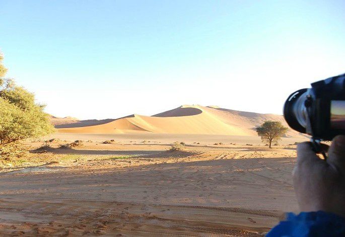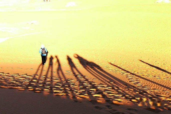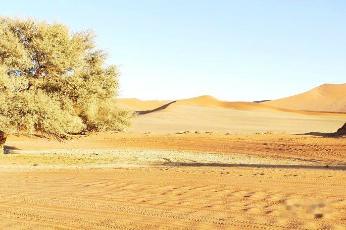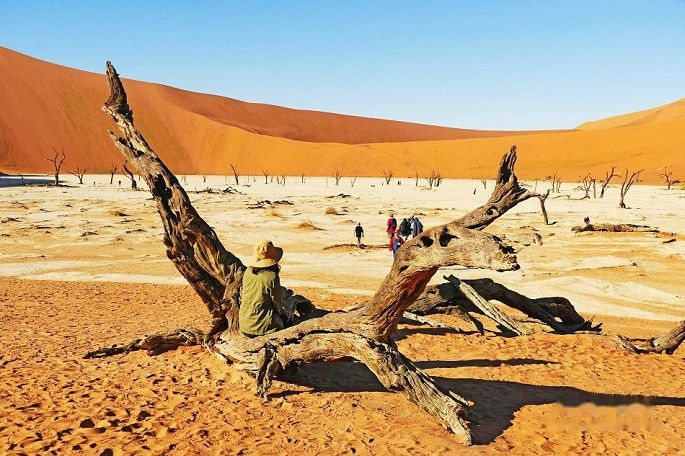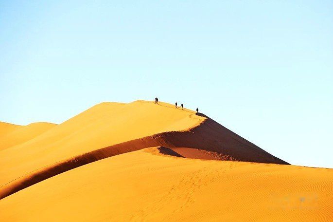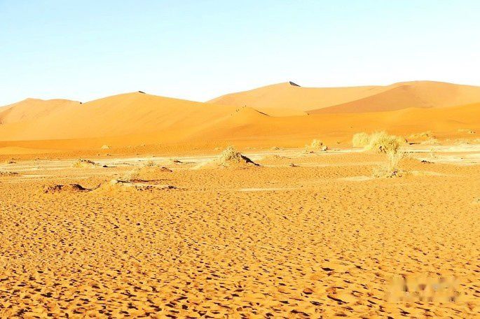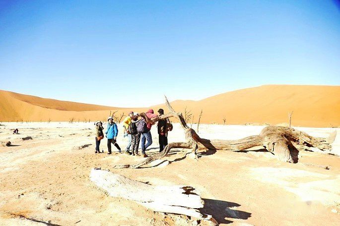 穿越死亡谷,是我们纳米比亚之旅最艰苦的行程。先要坐车到达死亡谷国家公园,然后再坐公园提供的越野车行至五公里来到死亡谷的边缘,这时车已经无法进入了,必须徒步行走两公里到达目的地。走沙地可与走平地决然不同,走一步留下一个沙窝,感觉是艰难的跋涉,鞋里灌满了细沙,沉沉的。