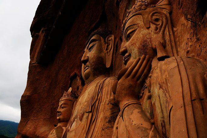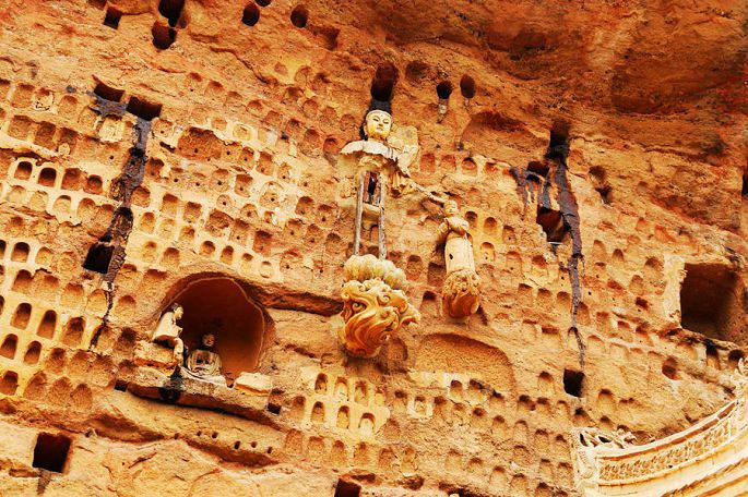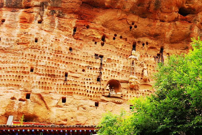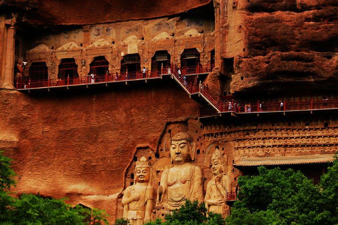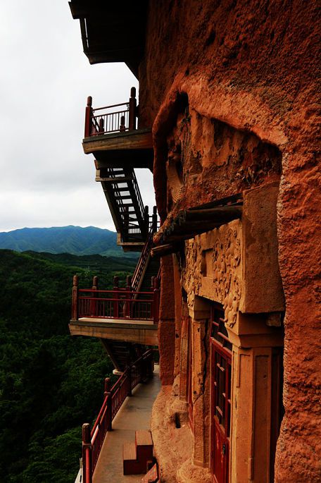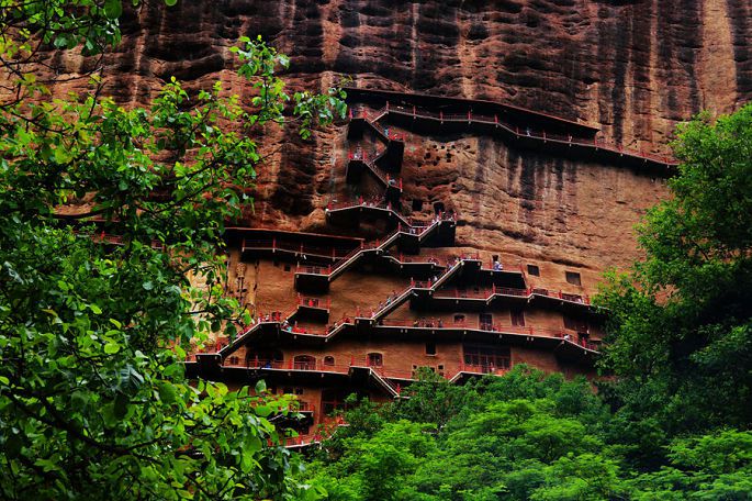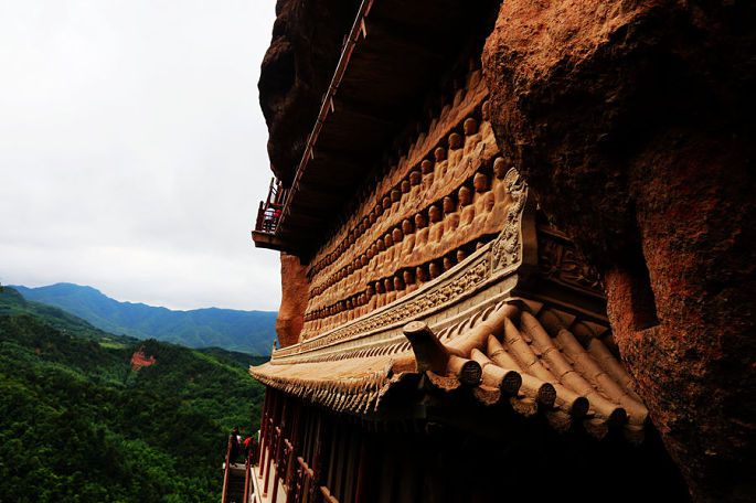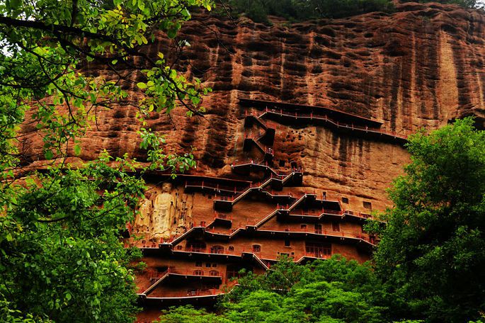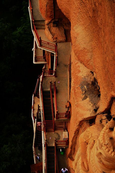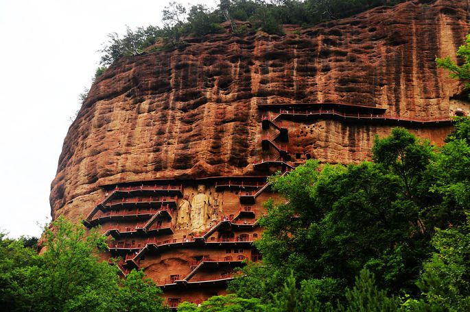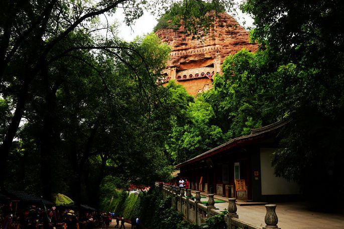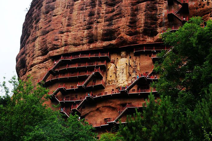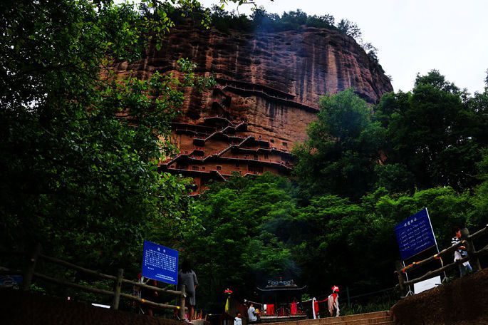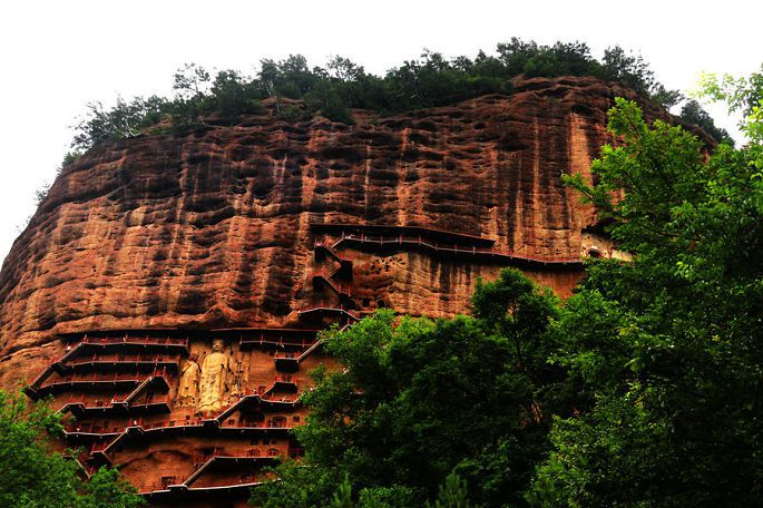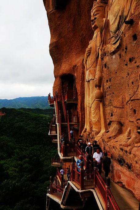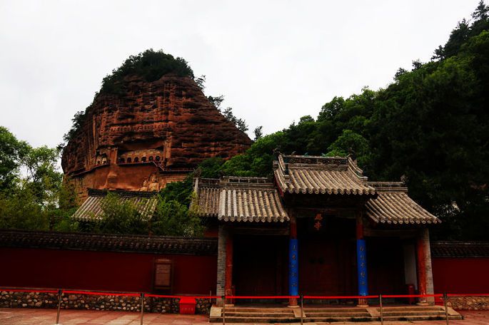 麦积山,是横亘我国中部的秦岭山脉西端的一座奇峰,海拔1742米,相对高度也就142米,孤峰崛起,形状如同农村地里常见的麦垛,所以当地人就把它叫做麦积山。这座独峰的西南面为悬崖峭壁,石窟就开凿在这峭壁之上。