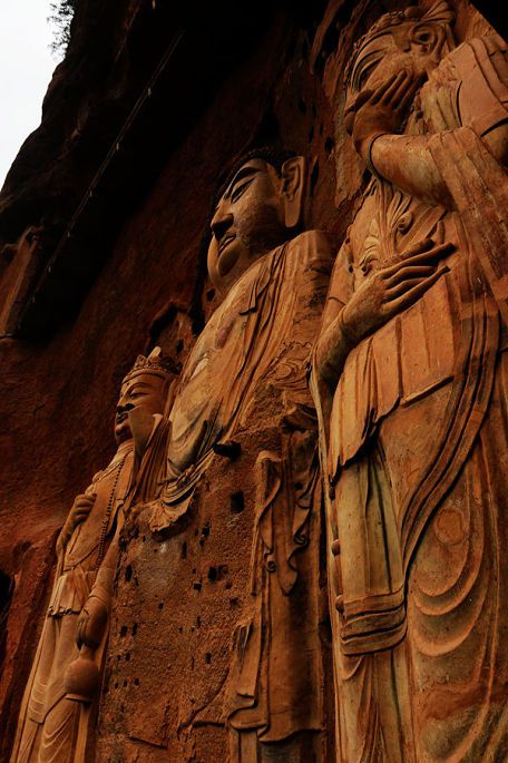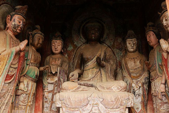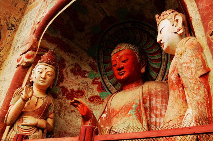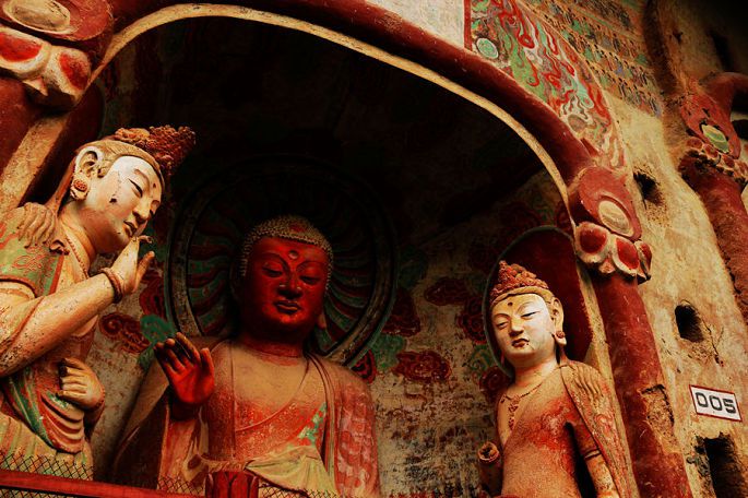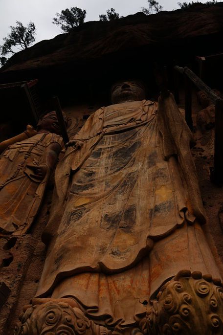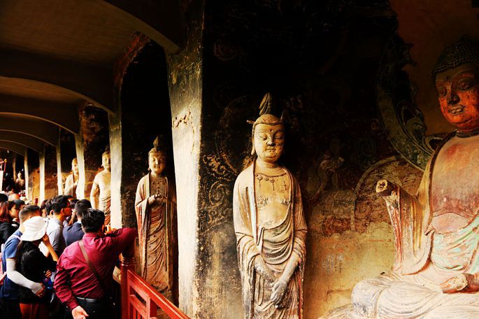 看资料介绍,麦积山石窟始建于公元五世纪初(十六国后秦时期),后来历朝历代都有过开凿或重修,现存有221座洞窟,1万多尊泥塑石雕,还有1000多平米的壁画,这些塑像和壁画,题材丰富多样,艺术精湛绝妙,是我们国家唯一保存北朝造像体系最完整的石窟,也是唯一能比较全面地反映出从公元五世纪到公元十八世纪中国泥塑艺术演变历史的石窟,同时还是唯一保存由中国北朝崖阁式建筑实例的石窟。