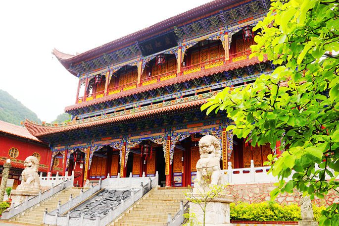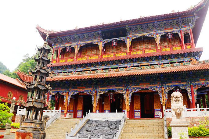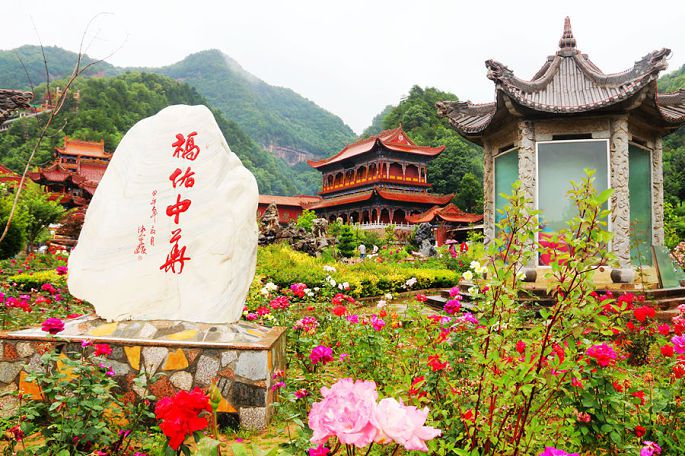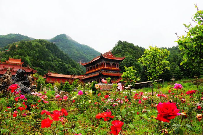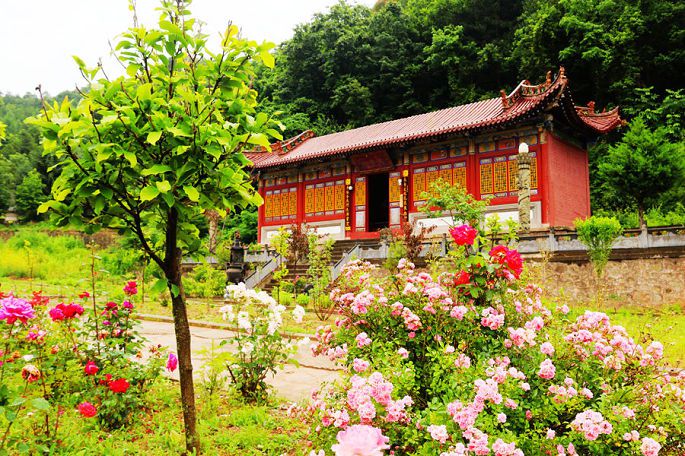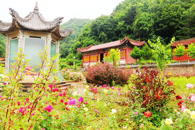 只见山凹里,各式仿古殿舍,依山而建,纵横分布,高低错落,感觉寺院规模还不小呢。寺院内到处鲜花盛开,花枝招展,梵音回荡,悦耳动听,这真是来到了一处清净、清幽、清爽的世外仙境,极乐世界!虽然此时小雨淅沥,一直不断,我们还是冒雨撑伞,饶有兴致地一一参观了这里的三进禅院、藏经阁、罗汉堂等建筑。