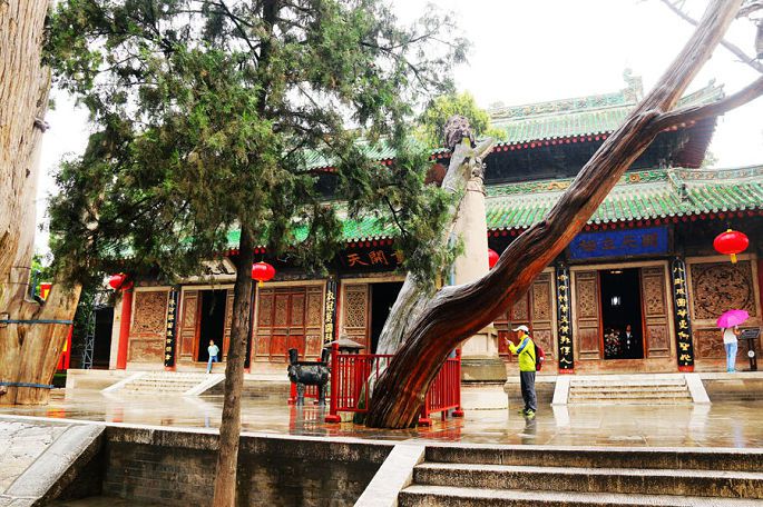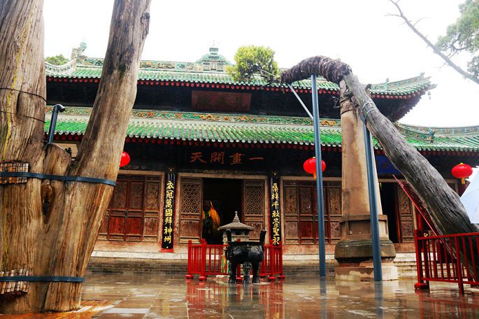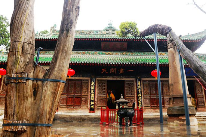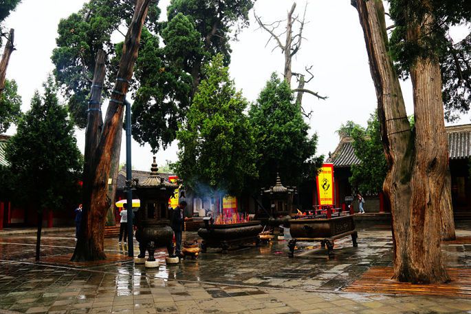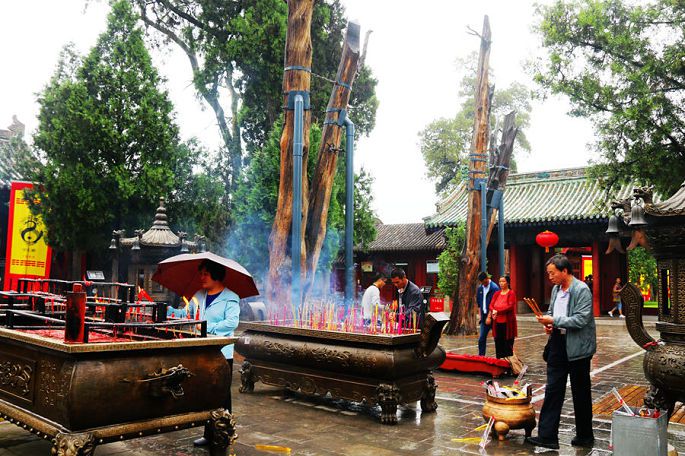 大殿前古柏参天,古槐苍劲,但由于年代久远,他们多显“老态龙钟”,有的甚至已东倒西歪,不胜风雨的侵袭摧折,为了保护这些古树,对它们大多做了加固支撑的处理。香火台上,香烟缭绕,朝拜之人络绎不绝。