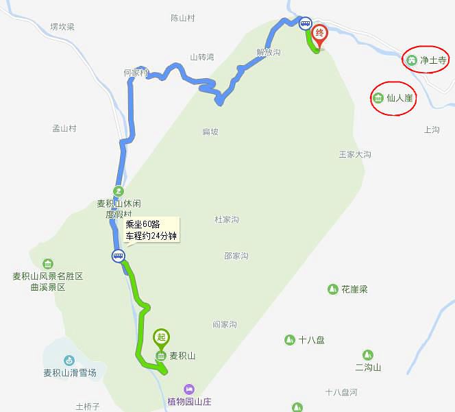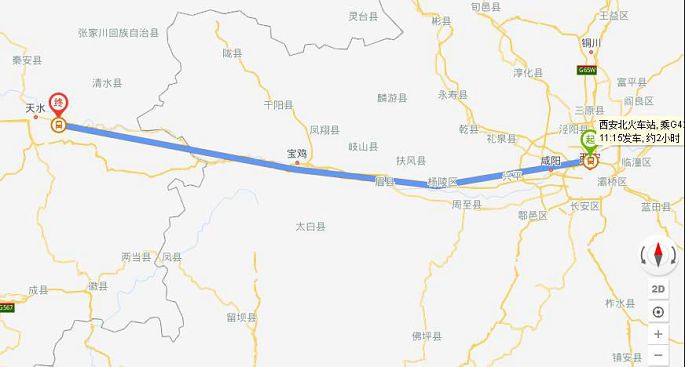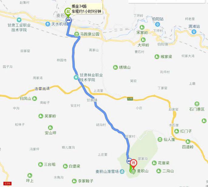 早上去西安北客站乘坐G4015高铁,11:15发车,12:59到天水南站,用时1小时44分钟。下车出站后坐1路公交车到火车站(3元),然后在天水火车站坐34路公交车(5元),约1个小时到终点麦积山景区的大门(距离市区约35公里)。从高铁站也有直达景区的公交车,但听当地人讲车次不多,错过时间,需要等待多时。